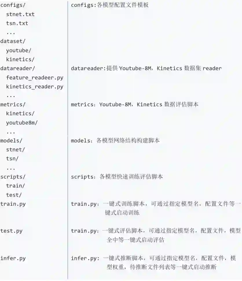 视频模型库提供通用的 train/test/infer 框架,通过 train.py/test.py/infer.py 指定模型名、模型配置文件等可一键式进行训练和预测。