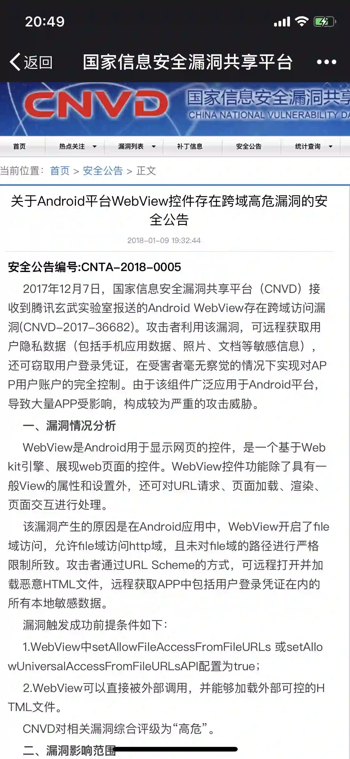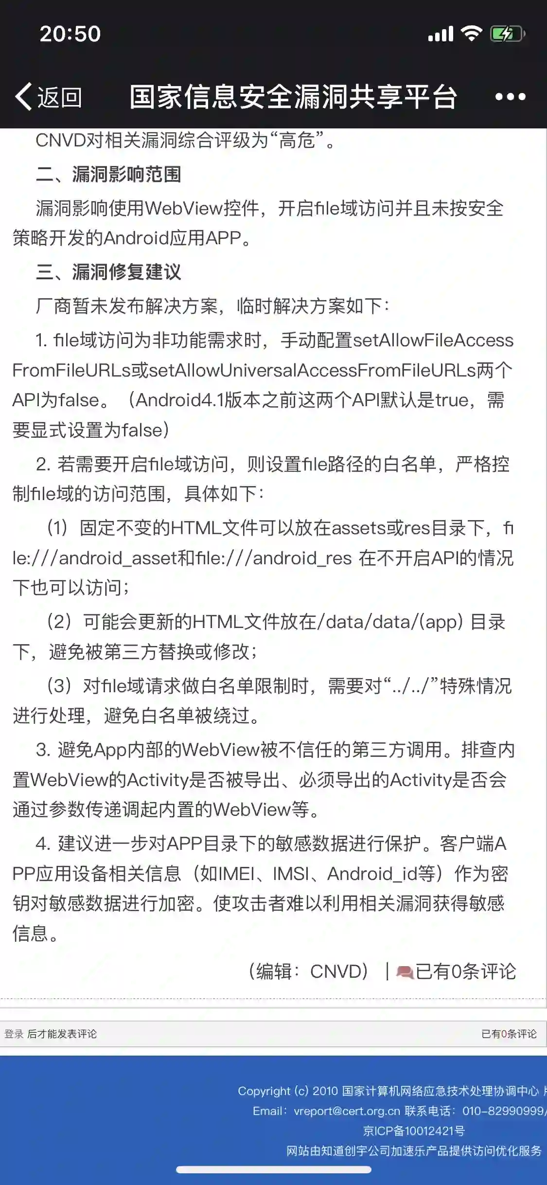 今天晚上7点半,国家互联网应急中心在旗下的CNVD(国家信息安全漏洞共享平台)对该漏洞(官方称其为“Android WebView存在跨域访问漏洞”)进行公告,对漏洞进行了分析,并给出了“高危”的安全评级以及修复建议: