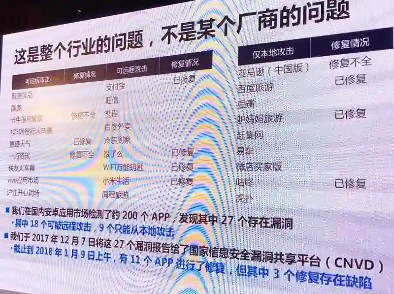 在TK提供一张PPT上,清晰地显示已彻底修复的包括支付宝、饿了么、Wi-Fi万能钥匙、小米生活、百度旅游、墨迹天气、驴妈妈旅游、咕咚;