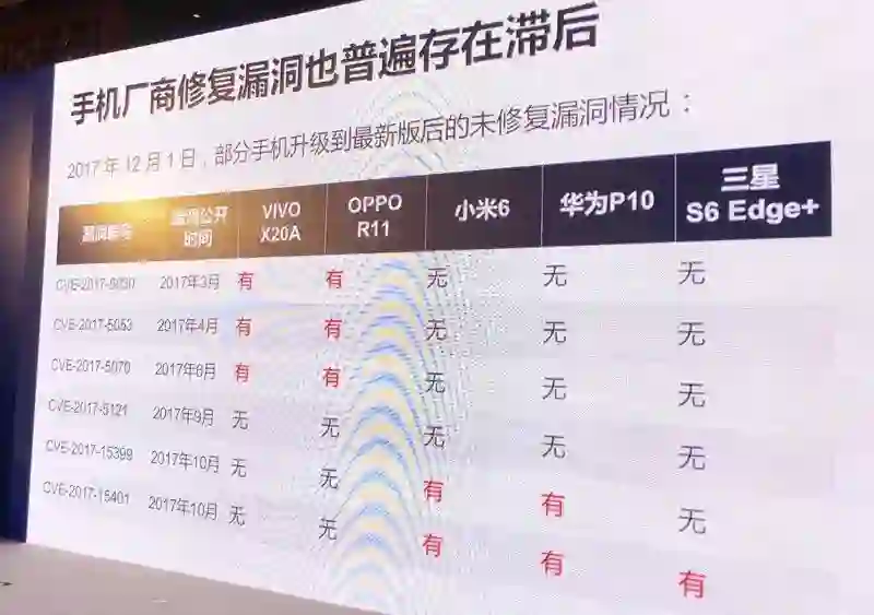 在其公布的一份名单中,包括三星、华为、小米、OPPO、vivo等手机厂商都存在修复漏洞滞后的现象,包括它们的最新旗舰机型。