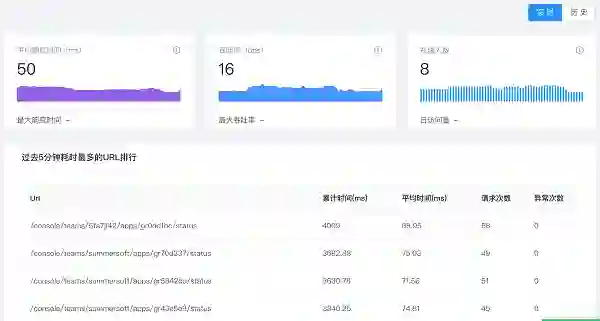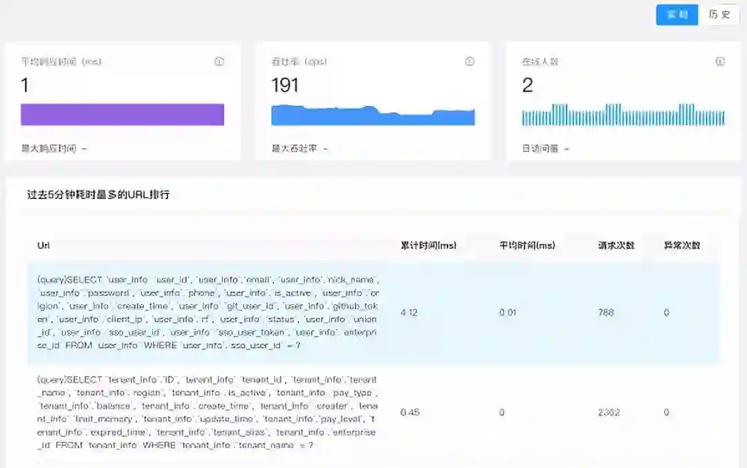 对于不同的服务协议,Rainbond 使用不同的指标实时表现吞吐率、响应时间,例如 HTTP 协议,使用 Path 的请求量和相应时间表达,Mysql 协议使用 SQL 执行量和响应时间表达。