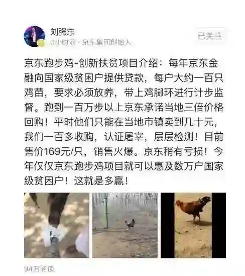这让文摘菌想起来五月份的时候,刘强东就已经在今日头条发布了京东版的“小鸡快跑”消息。据称带着鸡环的小鸡跑到一百万步以上会被京东以一百多元的价格收购,而且这群跑步鸡必须放养。