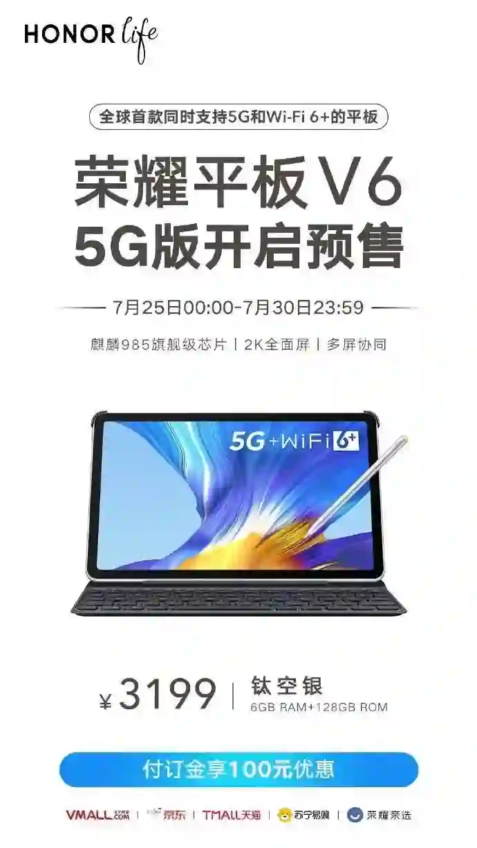 荣耀平板 V6 钛空银 5G 版本今天正式开启预售,6GB + 128GB 售价 3199 元。