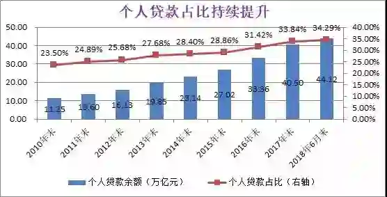 银行业的金融科技转型,零售业务是主战场。从贷款结构上看,截止2018年6月末,银行业个人贷款余额44.12万亿元,占比34.29%,保持了持续提升的态势。就个别银行而言,零售业务开始取代对公业务贡献主要的利润来源。以招行为例,2018年上半年零售业务税前利润占全部业务线税前利润的57.25%,同比上升0.26个百分点;平安银行2018年上半年零售金融业务营收占比51.2%,同比提升10.9个百分点。