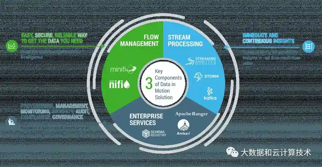 因为NiFi可以对来自多种数据源的流数据进行处理,Hortonworks认为HDF平台非常适合用于物联网 (IoAT)的数据处理。HDF中的数据流动可以是多个方向,甚至是点对点的,用户可以同收集到的数据流进行交互,这种交互甚至可以延伸到数据源,比如一些传感器或是设备。按照Hortonworks公司的说法,HDF产品是对HDP产品的补充,前者主要处理移动中的数据,而后者基于Hadoop技术,主要负责从静止的数据中获取洞察。可以看一看Hortonworks官方宣传对HDF的定位,已经号称是端到端流数据处理分析。