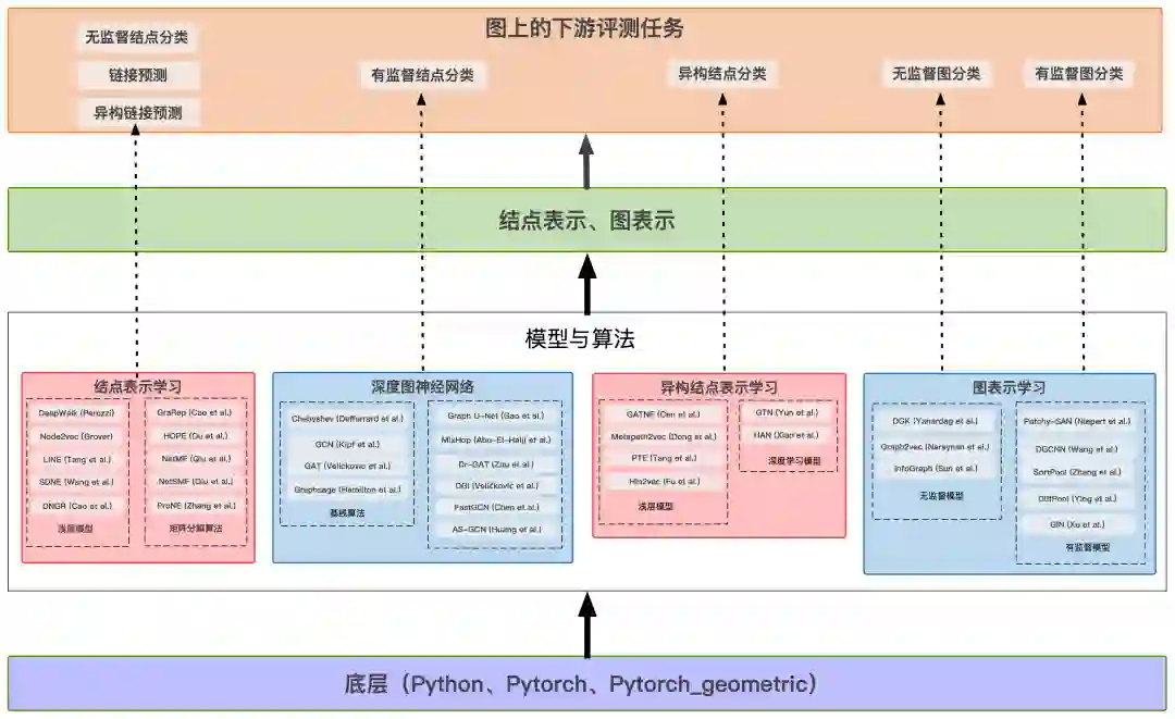 :一类是基于图神经网络的算法,另一类是基于 Skip-gram 或矩阵分解的算法。前者包括 GCN、GAT、GraphSAGE 和 DiffPool 等,以及适用于异构图的 RGCN、GATNE 等;后者则包括 Deepwalk、Node2Vec、HOPE 和 NetMF 等,以及用于图分类的 DGK、graph2vec 等算法。