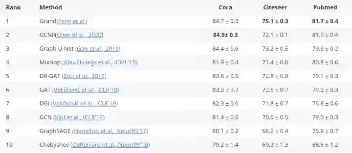 比如对于图上半监督节点分类任务,我们整合了常用的数据集 Cora、Citeseer、Pubmed,提供了经典的/前沿的各种模型(包括GCN、GAT、GCNII 等),提供了相应的训练脚本,并且整理出了一个相应的排行榜作为参考。” CogDL 开发者说。