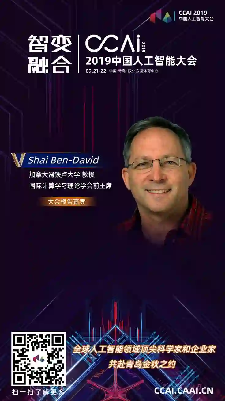 2019年中国人工智能大会(Chinese Congress on Artificial Intelligence 2019,简称“CCAI 2019”)将于9月21日-22日在青岛胶州召开。加拿大滑铁卢大学教授Shai Ben-David将出席大会并发表演讲。