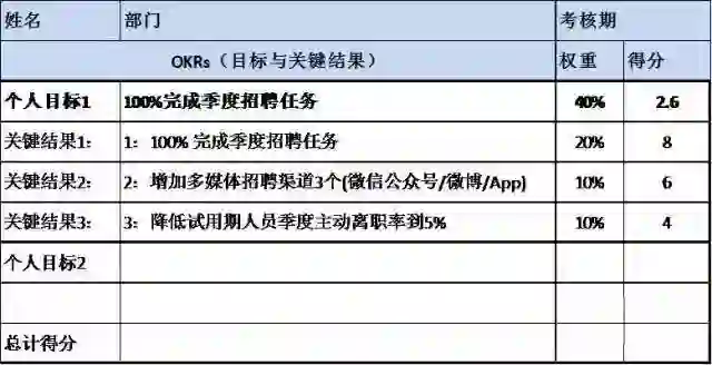 在模板里,我填写的是招聘经理某季度的一个目标和三个相应的关键结果。