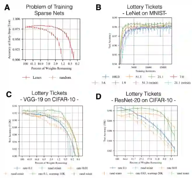 彩票假设:任何随机初始化的稠密的前馈网络都包含具有如下性质的子网络——在独立进行训练时,初始化后的子网络在至多经过与原始网络相同的迭代次数后,能够达到跟原始网络相近的测试准确率。