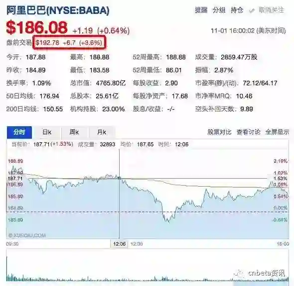 财报公布后,阿里巴巴盘前股价大涨,逼近193美元/股,市值或打破5000亿美元大关,京东和阿里巴巴,中间已经差了整整一个腾讯!