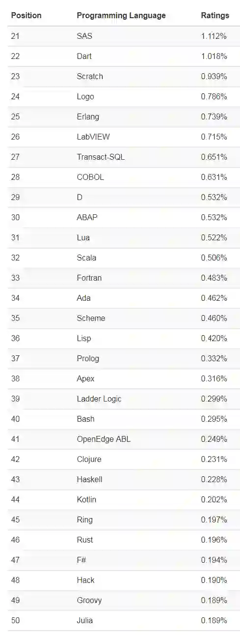 “年度编程语言”获奖名单如下图所示,该奖项授予一年中评分最高的编程语言: