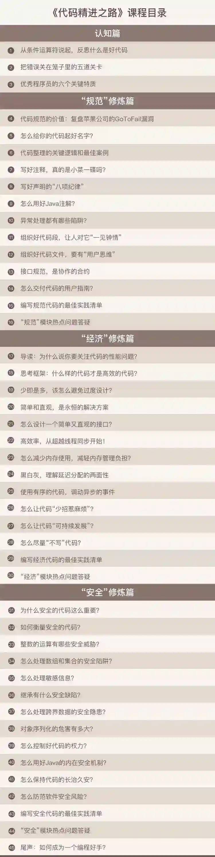 方法实操:专栏紧贴工作实际场景,会告诉你如何消除代码的安全隐患,并且教你一些高频代码问题的最优处理和预防方案,这些都是非常实用的。