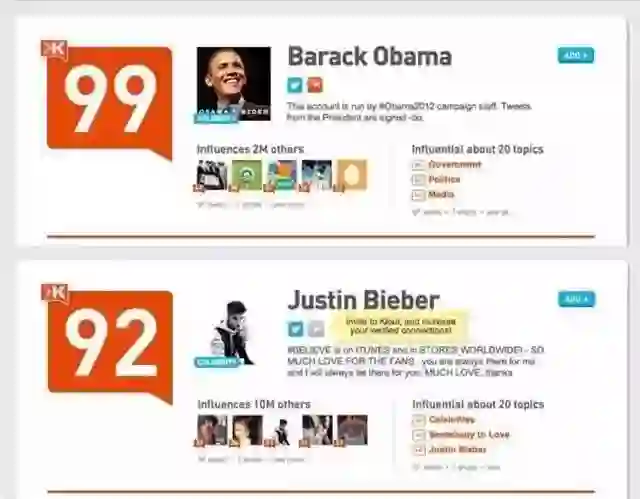 奥巴马、贾斯汀比伯Klout Score