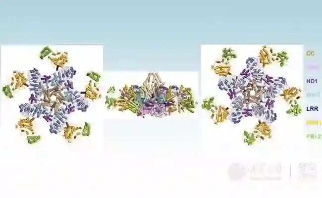 在长期对抗病原生物的过程中,植物进化出了复杂高效的两层免疫系统,用于识别各种病原微生物、激活防卫反应保护自己。处于两层免疫系统的核心是植物细胞内数目众多的抗病蛋白,它们既是监控病虫侵害的哨兵,也是植物动员高效防卫系统的指挥官。抗病蛋白被发现及在植物育种中大量应用已有20多年,但人们对其发挥作用的分子机制仍不清楚。清华大学柴继杰团队、中国科学院遗传与发育生物学研究所周俭民团队、以及清华大学王宏伟团队最近的联合研究,在植物免疫研究领域取得历史性的重大突破。合作团队发现由抗病蛋白组成的抗病小体并解析了其处于抑制状态、中间状态及五聚体活化状态的冷冻电镜结构,从而揭示了抗病蛋白管控和激活的核心分子机制。相关成果以两篇长文(Research Article)形式,分别以“病原蛋白诱导的ADP解离启动植物抗病蛋白”(Ligand-triggered allosteric ADP release primes a plant NLR complex)和“植物抗病小体的重组和结构功能基础”(Reconstitution and structure of a plant NLR resistosome conferring immunity)为题目,于2019年4月5日发表在国际权威学术期刊《科学》(Science)上。《科学》杂志同期发表了国际植物抗病研究权威科学家Jeffery Dangl和Jonathan Jones撰写的题为“耀眼的五星:植物抗病小体”(A pentangular plant inflammasome)的专文评述,高度评价这一重大突破性成果。