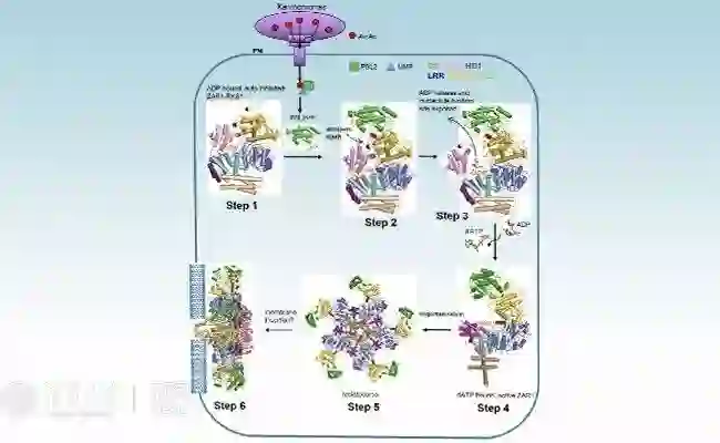 两篇文章的研究成果是通过对抑制状态复合物的结构和功能解析,阐明了抗病蛋白由抑制状态,经过中间状态,最终形成抗病小体的生化过程,合作团队紧密结合结构、生化和功能研究,揭示了抗病小体工作机制(图3)。比如,抗病小体形成后直接在细胞质膜上发出自杀指令,很可能是植物细胞死亡和免疫执行者。该项工作填补了人们25年来对抗病蛋白认知的巨大空白,为研究其它抗病蛋白提供了范本。