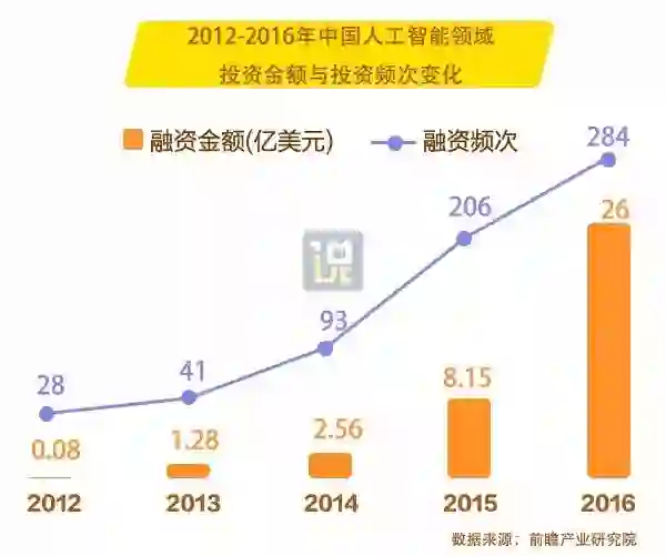短短一年间,AI行业的投融资呈爆发式增长。2012年,人工智能领域的全球风投只有5.89亿美元,到2016年猛增到50多亿美元。