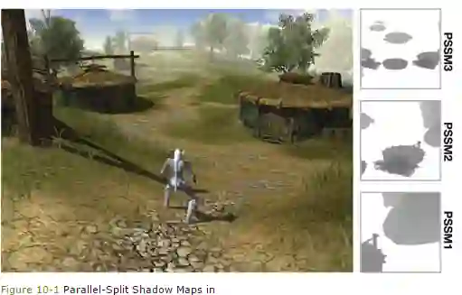 Parallel Split Shadow Map (PSSM) [15][16] / Cascaded Shadow Map(CSM)[17]:虽然Shadow Volume很吸引,但它需要大量的内存频宽,而且通常不能实现软阴影。后来大部分游戏改为使用Shadow Map(阴影贴图),这更适合GPU,并且可以通过多次采样(Percentage Closer Filtering, PCF)来实现软阴影。然而,阴影贴图也有许多问题,例如远近景物都采用同一张纹理,就会令到近景的精度不足,出现锯齿。2006年香港中文大学的博士生Fan Zhang等人发表了一种 PSSM 算法 [15],为不同距离的场景渲染多张阴影贴图,在采样的时候按距离决定使用那一张。这个方法的变种CSM,在切割上和PSSM有点差异,被广泛使用于现时大部分游戏引擎中。