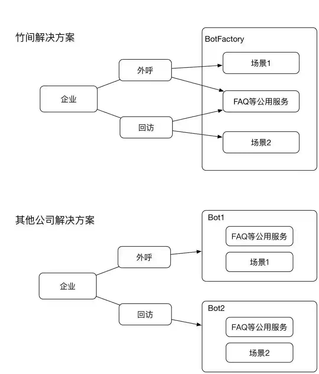 其他公司方案:每个机器人对应一套话术,一些通用性内容如产品及服务介绍,需要在两套话术中预先放置。