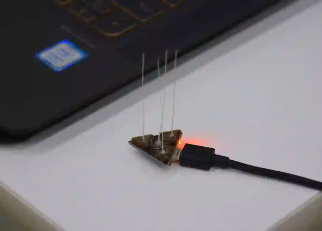 整个晶须阵列的制作也比较简单,将一团ABS塑料加热后拉成像太妃糖一样的细长纤维。每个晶须底部的ABS斑点粘在3D打印的负载板上,负载板又连接到三角形排列的力垫(实际封装的MEMS气压计)。四晶须阵列的材料成本约为20美元,重量仅为1.5克。