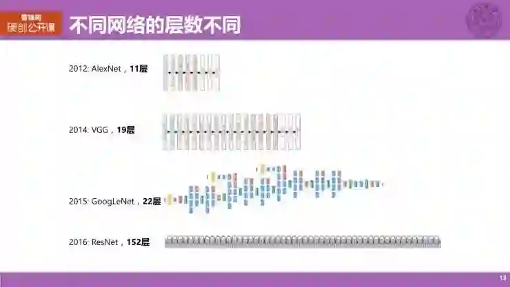 我们列举了四个非常经典的神经网络,分别是 AlexNet(11 层)、VGG(19 层)、GoogLeNet(22 层)与 ResNet(152 层),我们可以看到,因为识别精度的不同,我们往往会设计更深更复杂的神经网络,会导致网络层次变多,给硬件加速带来很大挑战。