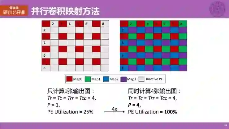 左边是刚刚讲的例子,采用我们方法后,我们试图在阵列上面同时计算四张 Map,利用率能从 25% 提升到将近 100%,这是一个很好的计算结果,它的并行度能提升四倍,那主要是因为我们同时计算四个 Output Map。值得一提的是 Output Map 所需要用到的输入数据其实是一样的,或者说它们的数据是共享的,这也就直接指导了我们后面的硬件架构设计。