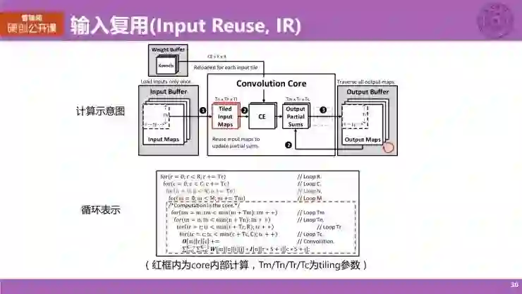 这个过程叫做输入复用,所对应的循环表达就是下面一个式子,不做具体的展开。我们可以看到,红色虚线框的这部分就是核心内部完成的计算,而输入复用对应的一种循环表达,其实是对外部的四层循环做一个次序的调整,就是我之前提到的循环次序调换,而其中涉及到的 Tm、Tn、Tr、Tc,分别对应的是之前提到的 M、N、R、C。我们这里称为 Tiling 参数,因为核心内部的局部存储非常有限,所以我们将 Input Buffer 内部的这些数据和权重导入到核心内部的时候就要做一个分块,也就是说我计算任务是一部分一部分来完成的,采用这样一种方式完成整个的计算任务。而刚提到的 Output Reuse 与 Weight Reuse,它其实所改变的就是外部存储循环的计算次序,也就是 Loop Interchange。