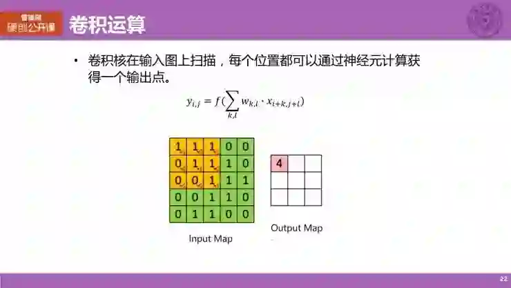 刚刚讲到的卷积核(kernel)会在左边 5×5 的 Input Map 上进行扫描,黄色的方框是一个 3×3 的卷积核。我们可以看到,每一个黄色小框的右下角会有一个权重分析,也就是具体的权重值。卷积核进行扫描的每个位置都会进行神经元的计算,并得到右边 3×3 的 Output Map 上的每一个点。可以看到,随着卷积核在 Input Map 的扫描,就可以得到 Output Map 上的每一个点,而具体的神经元计算其实和我们之前提及的人工神经元模型计算是完全一致的,这就是一个卷积运算的过程。