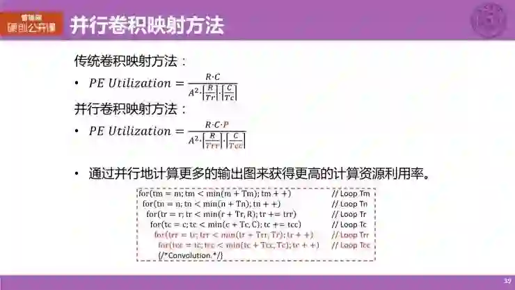 我们提出一种并行卷积映射方法,这个公式与传统卷积映射方法公式有些许的改变,主要体现在引入了一个更深层次的 Tiling 参数 Trr 和 Tcc,在分子上面引入了一个并行的因子 P。