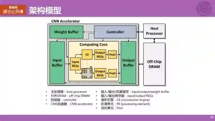 在架构里面有一个核心控制器 controller,然后片上通常会有三块 buffer,即 Input Buffer、Output Buffer 及 Weight Buffer,分别存储神经网络的输入数据、输出数据和权重。而中间的黄色部分为 Computing Core 也就是计算核心。