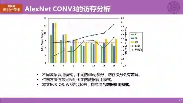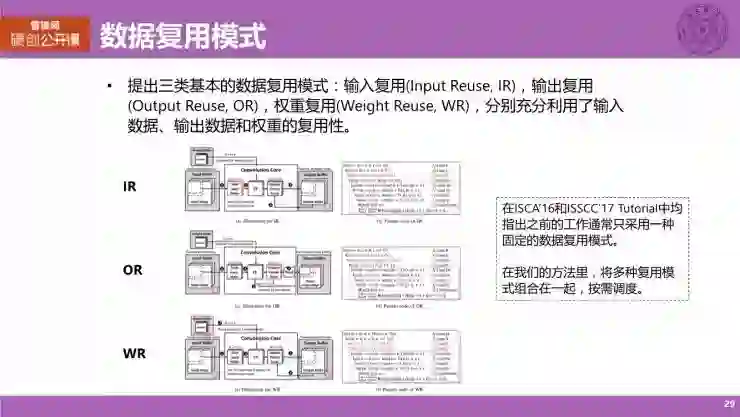 需要值得一提的是,在我们领域的两个顶级会议上,即 ISCA 16 以及 ISSCC 17 的 Tutorial 上均指出之前的工作都只采用一种固定的数据复用模式。我们在后面的分析会告诉大家,采用固定的服务模式并不是一种特别好的策略。