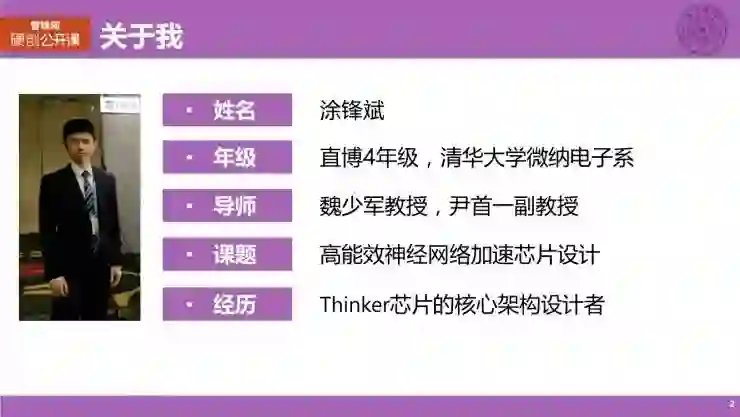 首先做一个自我介绍。我是清华大学微纳电子系的博士生涂锋斌,今年直博四年级,我的导师是魏少军教授和尹首一副教授,博士课题是高能效神经网络加速芯片设计,研究兴趣包括深度学习,计算机体结构及集成电路设计。