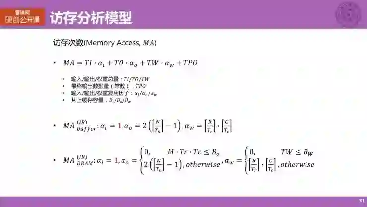 至于公式 TI、TO、TW 只是当前层的输入、输出和权重的总量,TPO 表示的是当前层的最终输出数据总量,它是一个常数;αi、αo、αw对应的就是输入输出权重的复用因子,我就不过多解释了。