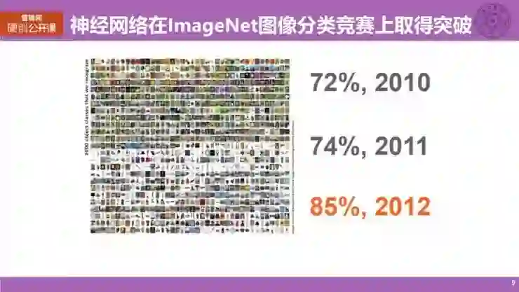 在 2012 年,神经网络 AlexNet 在 ImageNet 图像分类竞赛上取得突破,获得了 85% 的准确率,相较于之前最好的识别率提升了 10% 以上。这是一个非常大的突破,在当时引起了非常广泛的关注。而现在,每年举办的 ImageNet 的识别精确度已经超过了 95%,已经超过人类识别图片的能力。这是一个非常惊人的结果。直至今年,每年拔得头筹的团队都是采用神经网络。