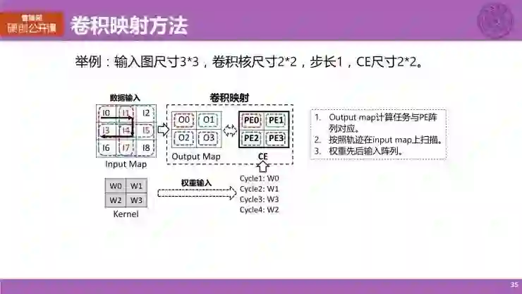 第三点,对于权重来说,它紧跟着输入数据的节拍,先后输入阵列,整体的过程就是卷积映射的方法,这个方法是一个非常经典的、大家通常会使用的方法。在现有很多的当前的工作中都采用类似的一些方法,比方说像一些利用阵列形式计算的硬件架构都会通常采取类似的方法,当然在细节上会稍许的不同,不过基本上的原理是类似的。