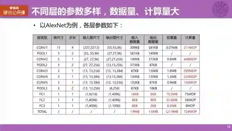 以 AlexNet 为例,最左列呈现了所有层的类型和名字,后面的一系列参数表示它的核尺寸、步长、输入输出图尺寸等。因为参数不同,它们的数据量与计算量都不同,且非常大。