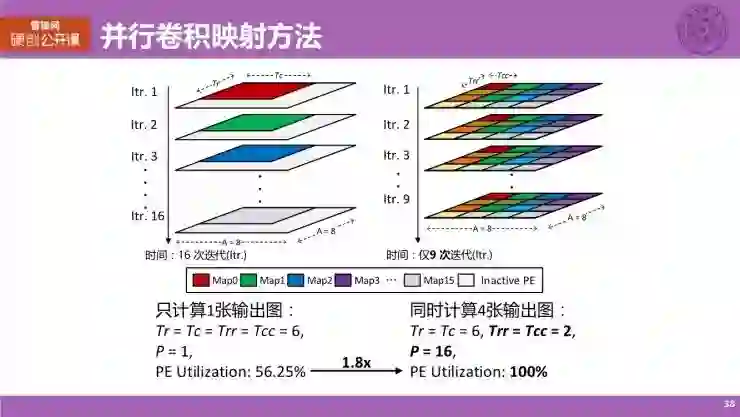 这里我们给出时间轴上的一个展开图,左边是传统的情况,右边就是用我们的方法之后的一种情况,简单来说,传统方法是在 8×8 的阵列上计算 6×6 的输出图,如果要计算 16 张不同的 Map(用不同颜色表示),那我们总共需要 16 次迭代,我们可以认为一次迭代代表一次时钟周期,那么 PE 的利用率只有 56.25%。