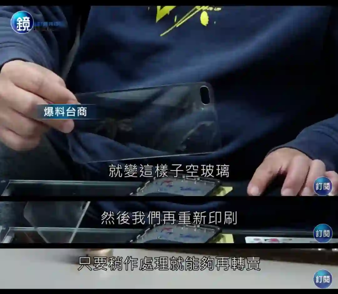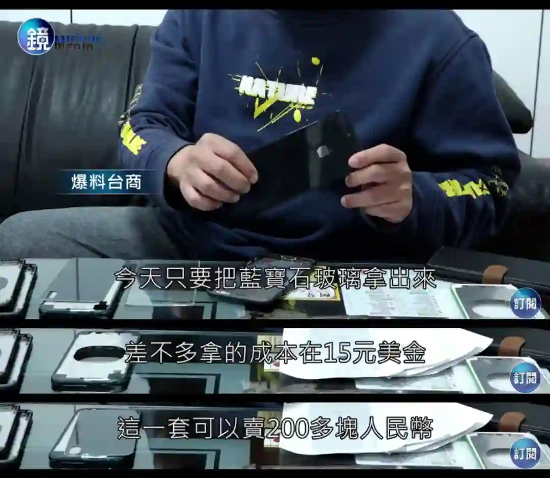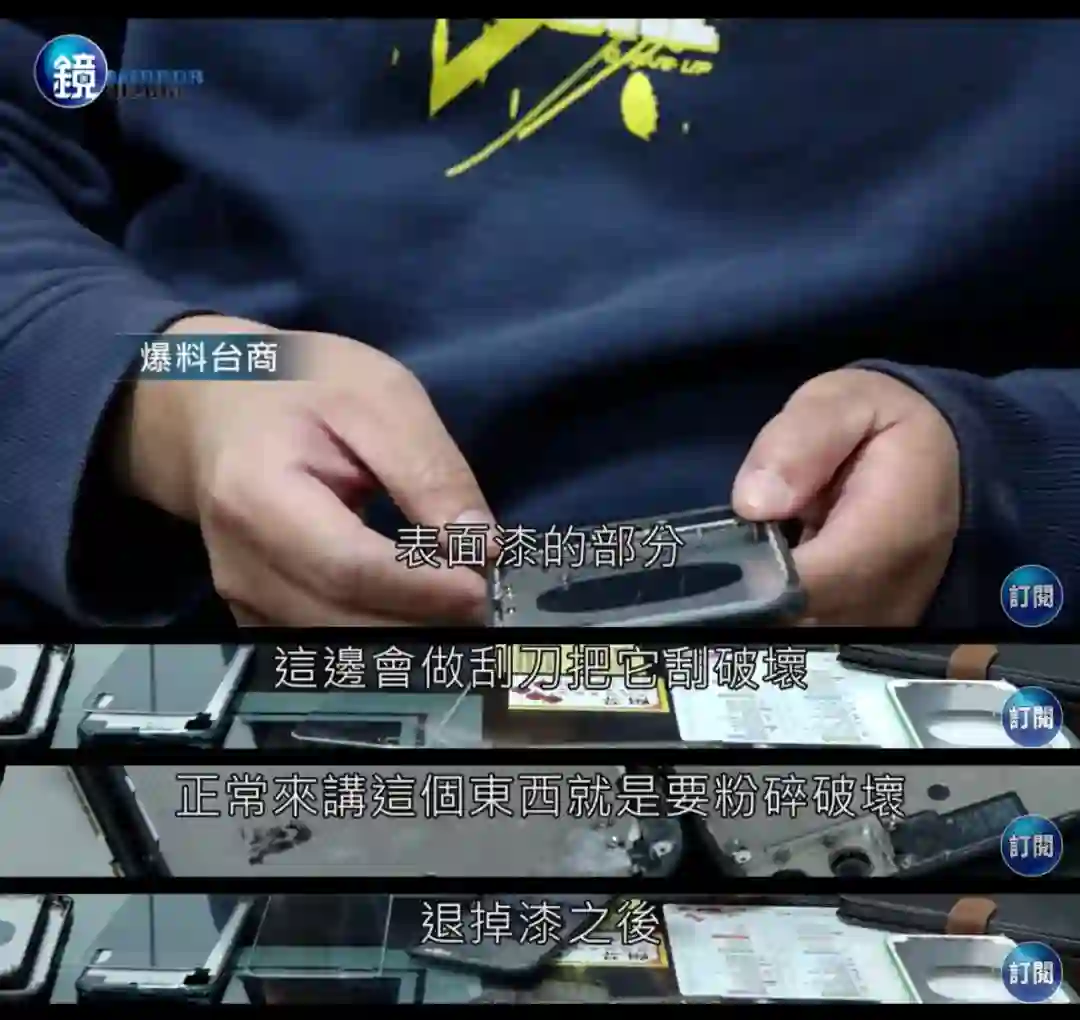 「(iPhone 后面板瑕疵品上的划痕)这些都是故意做出来的刮痕,因为这样工厂才能将这些背盖归为不良品,转卖给我们,玻璃上这些刮痕只要经过退色及印刷处理,就可轻易去除,花费不到新台币 150 元(约 35 元)。我们买入的成本每片 450 元(约 105 元),但可以卖到 1000 元以上(约 230 元),利润很高,几乎是买一片赚一片。」X 先生说。