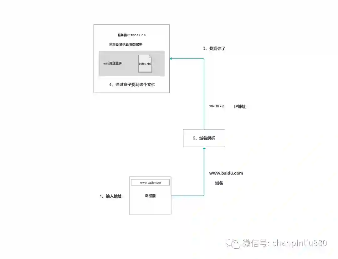 通常浏览器访问的网页被称为web页,每一个web页都有一个唯一的地址,不同的地址组合在一起,通过链接之间相互跳转,最终形成一个网站系统,我们使用的各种网站,需要通过网站的域名进入,所谓的域名就是每一个网站的唯一地址,例如百度的域名是:“baidu.com”,当我们在浏览器里面输入www.baidu.com,这个域名的时候,通过域名解析器,将域名解析成IP地址,通过这个IP地址找到服务器的IP,找到服务器以后,就会在服务起里面找到相关的文件,如下图(看不清可点击放大查看):