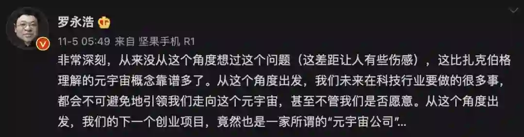 「交个朋友」的罗永浩也发博透露自己下一个创业方向,「竟然」也是元宇宙。