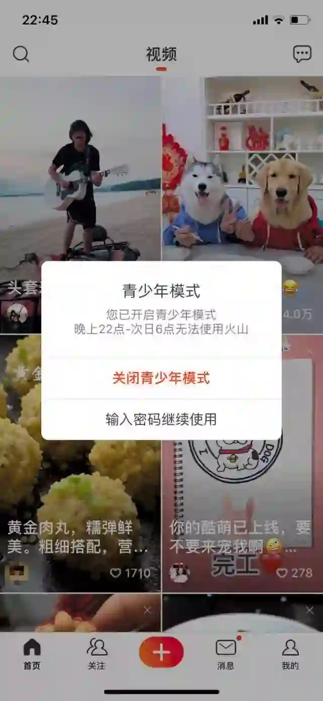 4月24日凌晨,记者登录快手短视频平台发现,确实因为“防沉迷”期间无法登录平台,需要监护人输入密码后才能继续使用。记者随即以“青少年”模式登录抖音、火山时,同样显示无法登录。