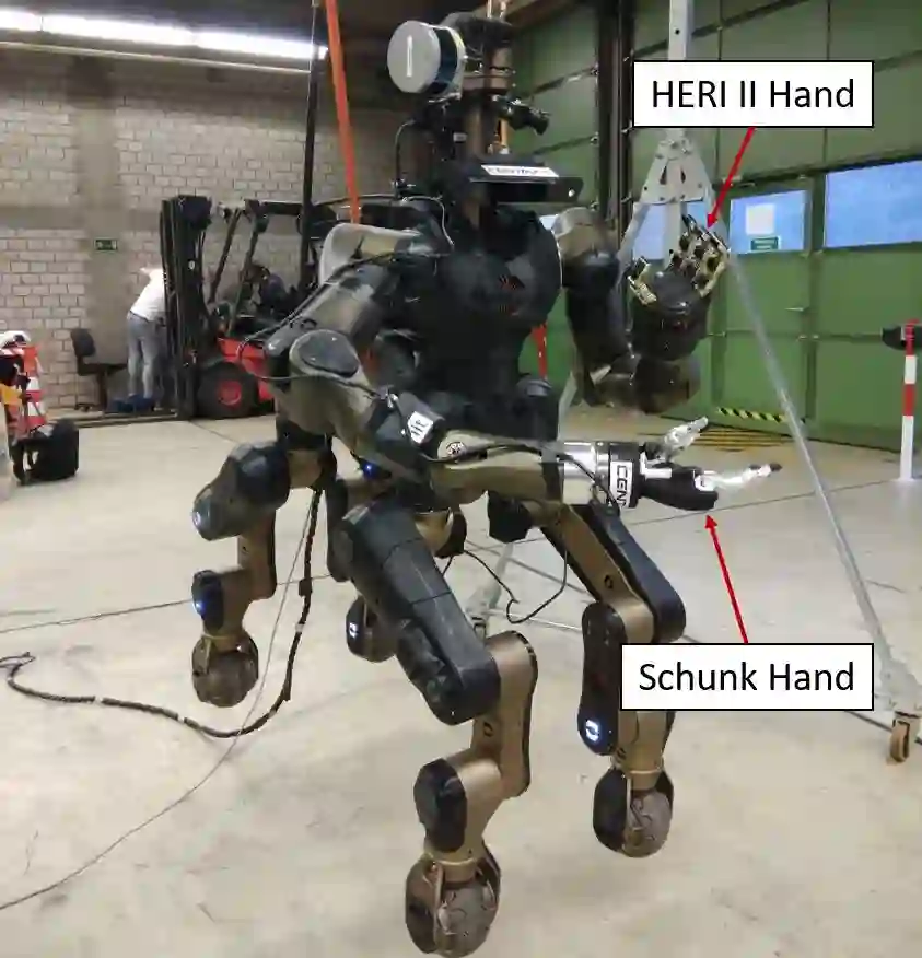左手是基于欠驱动方案的HERI II Hand——这是我们部门自行设计的机械手,因为欠驱动自由度缺失的缘故,无法实现像雄克灵巧手一般的精巧操作,不过另一方面欠驱动的特性带来了非常好的鲁棒性:即HERI II Hand的定位是进行较为强有力、且受冲击较大的抓取操作。