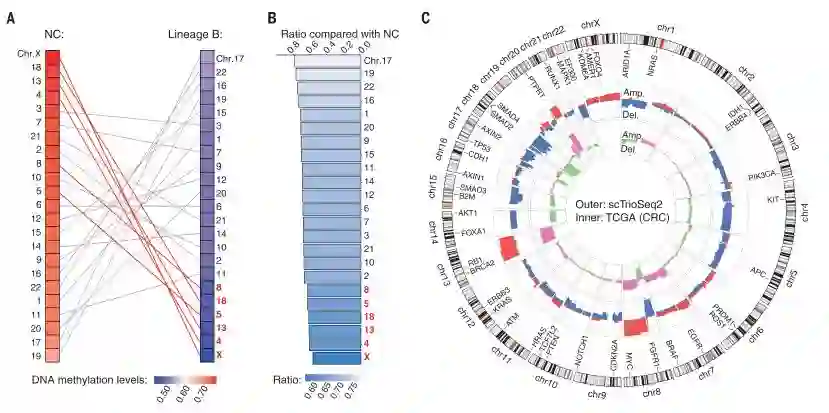 利用新的scTrio-seq2方法,研究人员对来自12例结直肠癌患者的1800多个单细胞进行了多组学测序。同时,研究人员采集了10例患者的原发肿瘤和转移肿瘤的样本,并获得了与这10例患者匹配的原发和转移数据。通过分析测序数据,研究人员就能够识别每位患者克隆突变产生的遗传谱系,并与基因表达、拷贝数变异和甲基化数据联系起来,以跟踪肿瘤是如何演化成转移性肿瘤的。此外,从肿瘤的多个区域取样也有助于分析识别瘤内异质性。