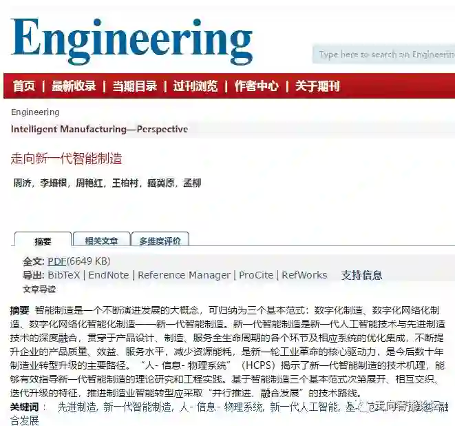 近日,中国工程院院刊《Engineering》推出最新观点性文章“走向新一代智能制造”,作者周济、李培根、周艳红等,文章指出智能制造是一个不断演进发展的大概念,可归纳为三个基本范式:数字化制造、数字化网络化制造、数字化网络化智能化制造——新一代智能制造。新一代智能制造是新一代人工智能技术与先进制造技术的深度融合,是新一轮工业革命的核心驱动力。“人-信息-物理系统”(HCPS)揭示了新一代智能制造的技术机理,能够有效指导新一代智能制造的理论研究和工程实践。推进制造业智能转型应采取“并行推进、融合发展”的技术路线。