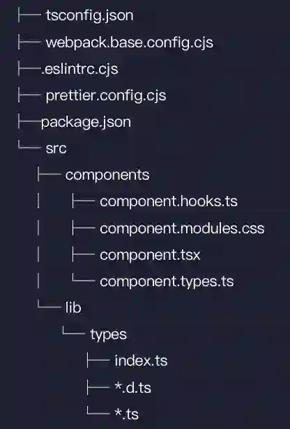 除了最外层的项目配置文件外,首先,一个 component 下会有以 component 为前缀的四个文件,分别是 hook.ts、.css、.types.ts 以及 component 本身,类型定义相关的代码会被放到单独的.types.ts 文件中,这样做是为了使 component 仅仅只包含业务逻辑代码。