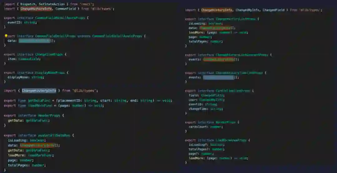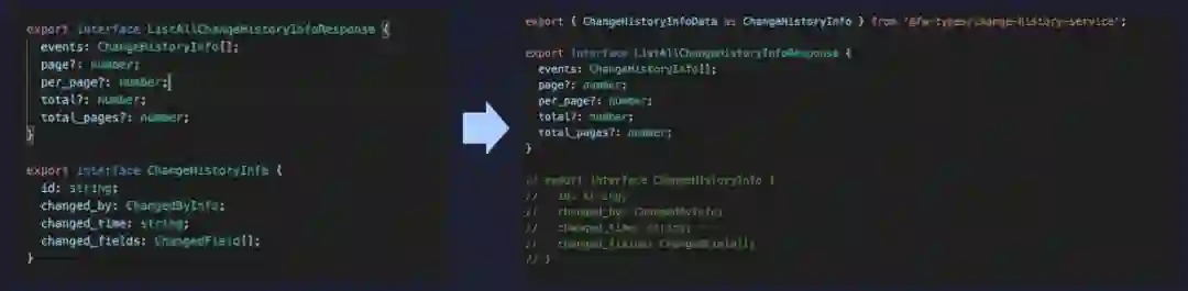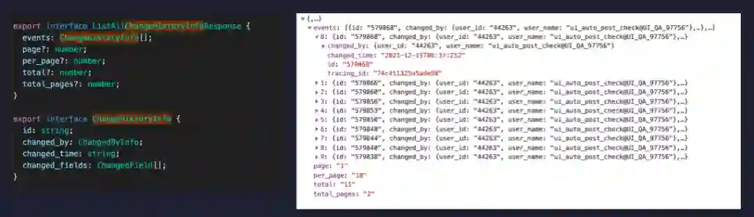首先是后端接口数据类型,看这个例子,这里定义的 ListAllChangeHistoryInfoResponse 就是后端返回的数据类型,其中每一项的类型是 ChangeHistoryInfo。