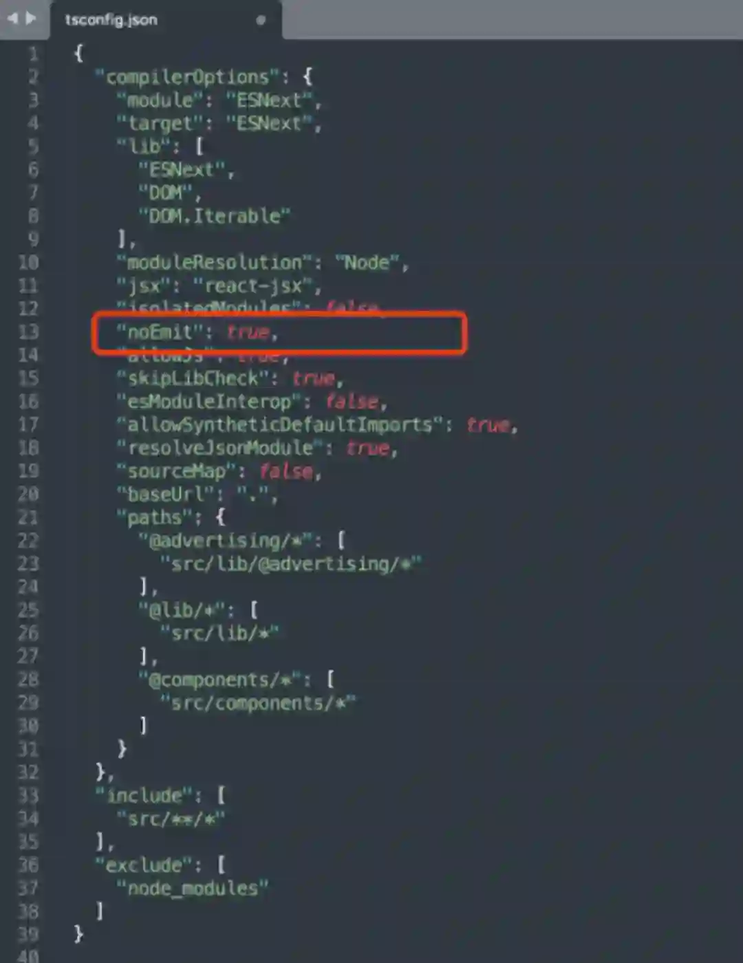 这里我重点挑了几个参数:首先我们把 noEmit 设置成了 true,因为在我们项目中 tsc 只负责进行类型检查,并不真实输出 js 和.d.ts 文件。