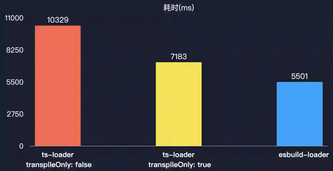 那么可不可以更快呢?大家都知道 esbuild 是一个基于 Go 的打包工具,它的运行效率是非常高的,所以我们用 esbuild-loader 替换了 ts-loader,它的运行过程也是剔除类型进行语言转化,同样我们可以用别的插件来单独解决类型检查的问题,可以看到耗时又显著减少了。