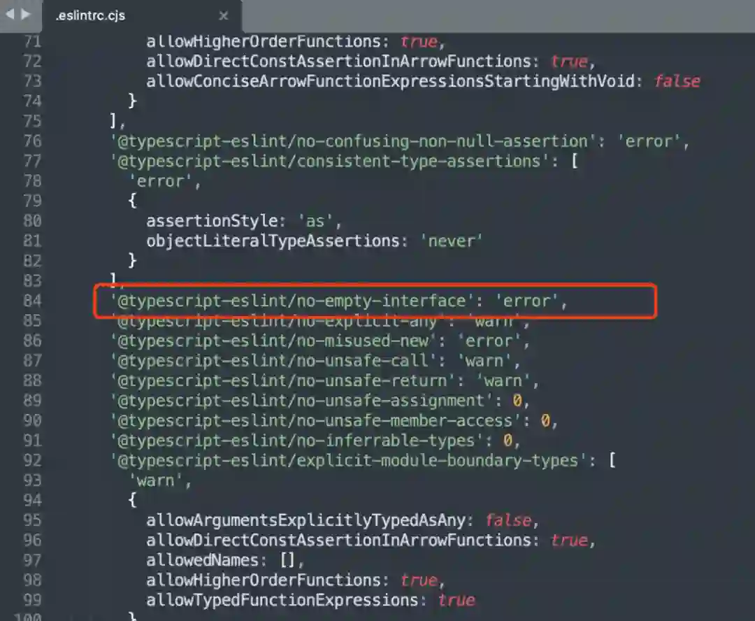 上图是我们的 eslint 配置,具体每一条官方文档都有清楚的解释,这里就不逐条解说了,我就拿 no-empty-interface 为例,当我们代码里写了这样的 code: