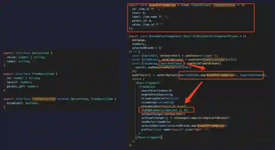 还有一类是公共组件或者通用方法的某些参数的类型,从右边的代码中可以看到,这里的 TreeSelect 有一个属性是 flatOptions, 它的类型就是左侧定义的 TreeOptionItem 所组成的 list,我们在项目中一个常见的场景是请求回后端数据,经过一个数据转换的函数,把数据 format 成 option 类型的数据,传给 TreeSelect 做展示。